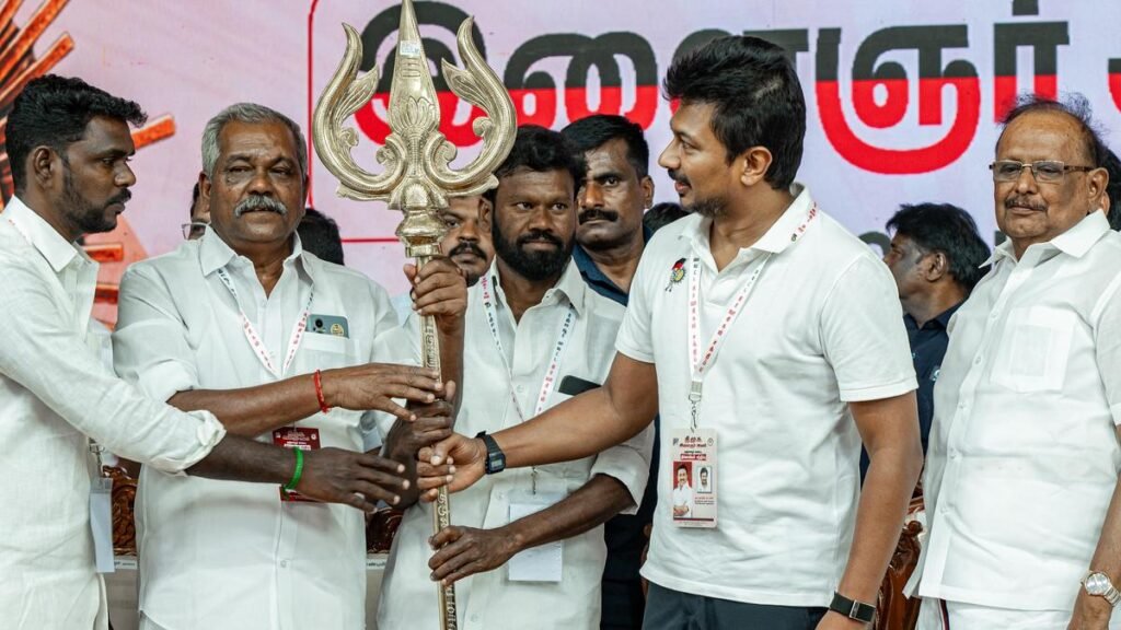 Deputy Chief Minister Udhayanidhi Stalin receives a trishul from party members of DMK’s youth wing at a public meeting at Sengipatti in Thanjavur on Sunday. | Photo credit: R. VENGADESH
