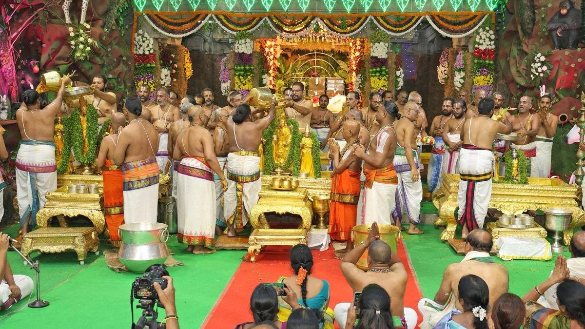 Priests performing ‘Snapana Thirumanjanam’ to the deities on the last day of the annual Vasanthotsavams in Tirumala on Wednesday.