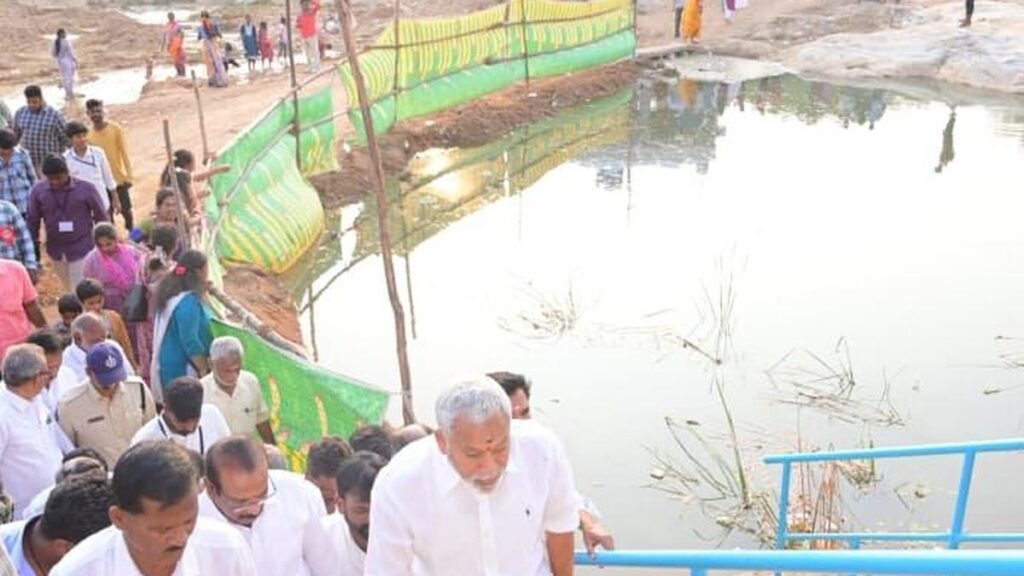 Chandragiri MLA Pulivarthi Nani inspects the arrangements at the Mukkoti temple on the banks of Swarnamukhi river near Tirupati on Sunday. | Photo credit: BY ARRANGEMENT
