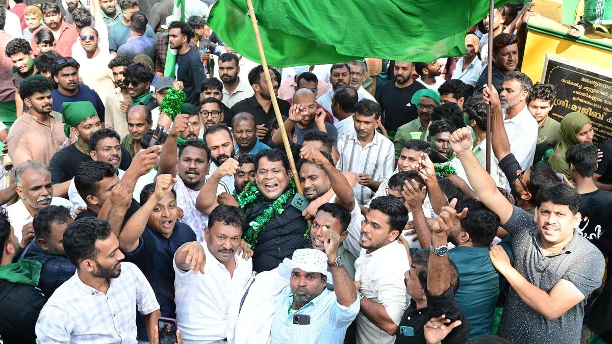Indian Union Muslim League workers celebrate UDF victory in Malappuram village. | Photo credit: SAKEER HUSSAIN