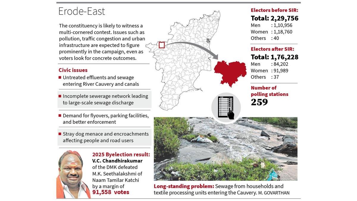 With an electorate of about 1.76 lakh, Erode (East) has the lowest number of voters among the eight constituencies in the district. As many as 53,528 names were deleted after the Special Intensive Revision (SIR), making it the only constituency in the district with less than two million voters.