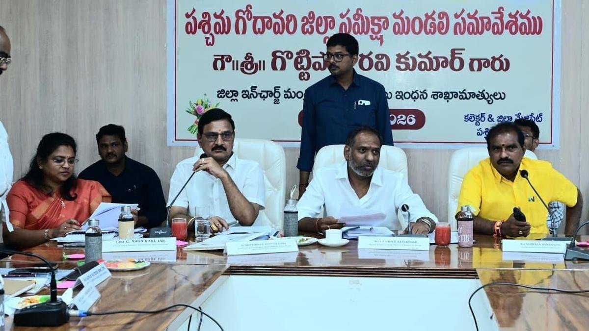Union Minister B. Srinivasa Varma, Ministers Gottipati Ravikumar and Nimmala Ramanaidu during the West Godavari District Development Review Committee meeting in Bhimavaram on Saturday. | Photo credit: Special arrangement