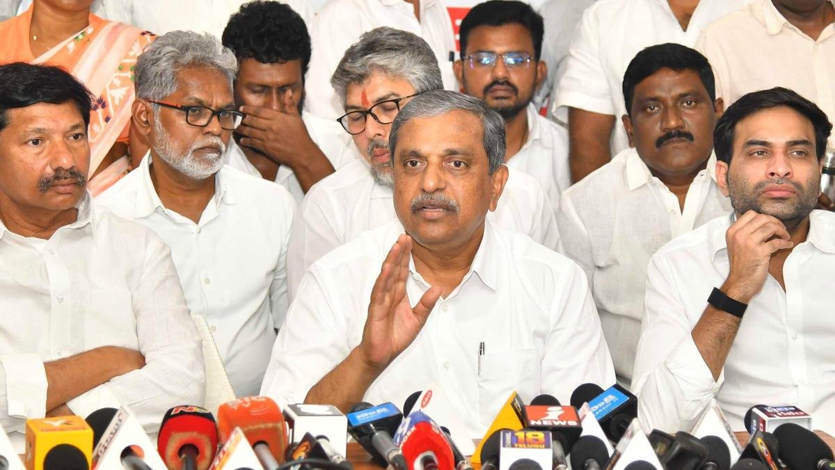 YSR Congress Party state coordinator Sajjala Ramakrishna Reddy addressed the media along with former minister Jogi Ramesh at the latter’s camp office in Ibrahimpatnam near Vijayawada on Monday. | Photo credit: HANDOUT